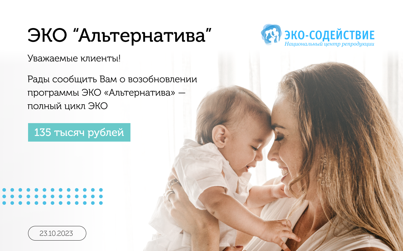 23.10.23 Уважаемые клиенты! Рады сообщить Вам о возобновлении программы ЭКО «Альтернатива» — полный цикл ЭКО за 135 тысяч рублей.